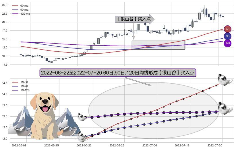 形态多维评估: ⚀ 2022-06-23-日至2022-07-20-日显现 60日-90日-120日均线 【银山谷】买入点 看多信号,后市看涨,买入