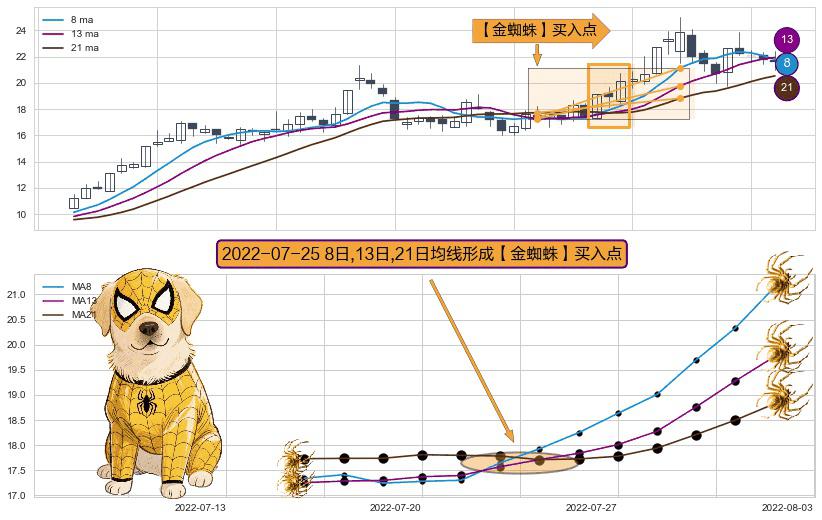 形态多维评估: ⚀ 2022-07-25日显现 8日-13日-21日均线 【金蜘蛛】买入点 看多信号,后市看涨,买入