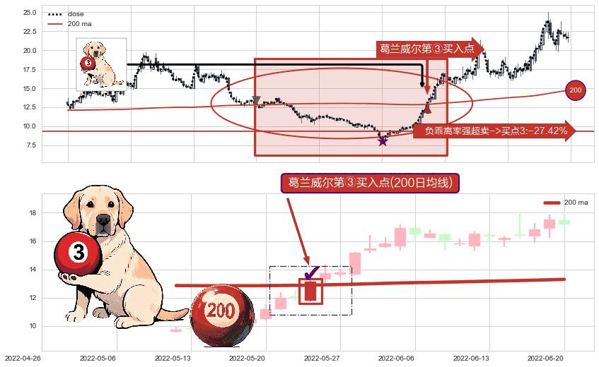 形态多维评估: ⚀ 2022-05-25-日显现 葛兰威尔均线 200日均线 第③买入点 上升趋势的中继信号,后市看涨,买进信号
