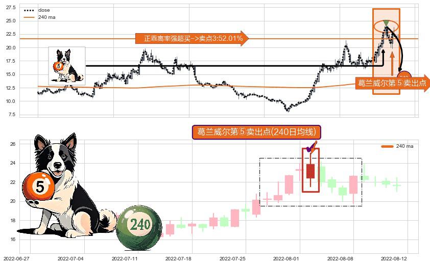 形态多维评估: ⚀ 2022-08-02-日显现 葛兰威尔均线 240日均线 第⑤卖出点 上升趋势均值回复的短线回落信号,后市看跌,卖出信号