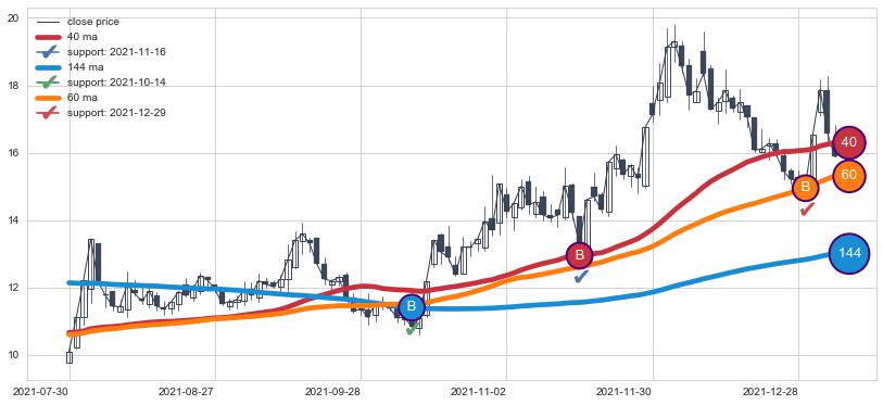 上涨趋势2021-07-30-2022-01-05,均线40, 60, 144确认关键支撑3处