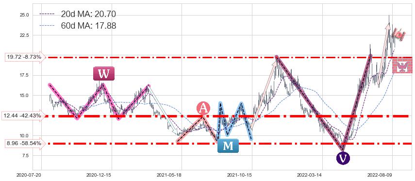 ♘ 支撑价格位19.72,可信任强度55.07%,距离最后交易2022-08-12形成的收盘价格21.61相差 -8.73%