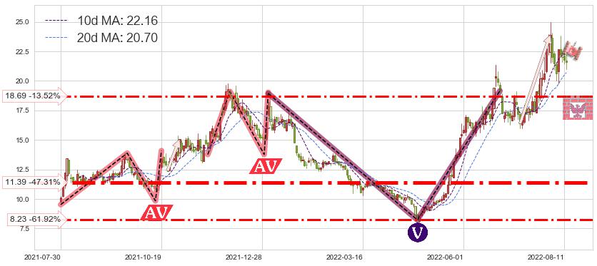 ♘ 支撑价格位18.69,可信任强度62.24%,距离最后交易2022-08-12形成的收盘价格21.61相差 -13.52%