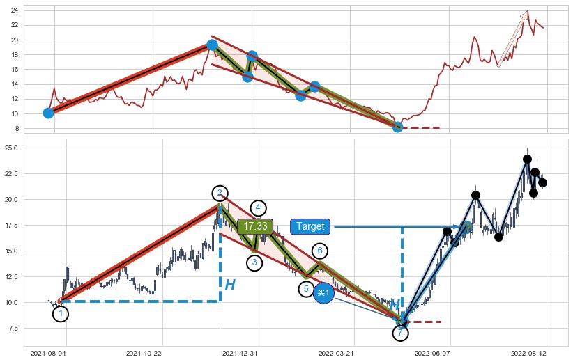➢ 最小中继整理涨幅→𝐇: 9.21 (𝐇楔型旗杆的长度:楔型起点→顶点)