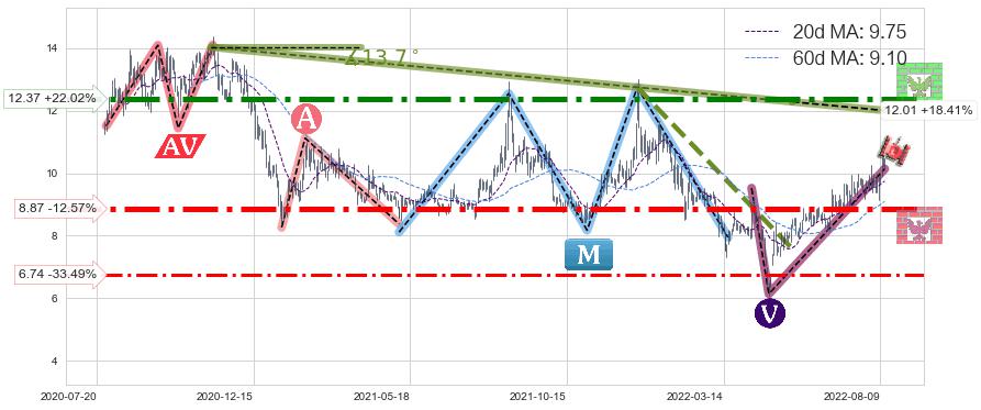 ♘ 阻力价格位12.37,可信任强度94.13%,距离最后交易2022-08-12形成的收盘价格10.14相差 +22.02%