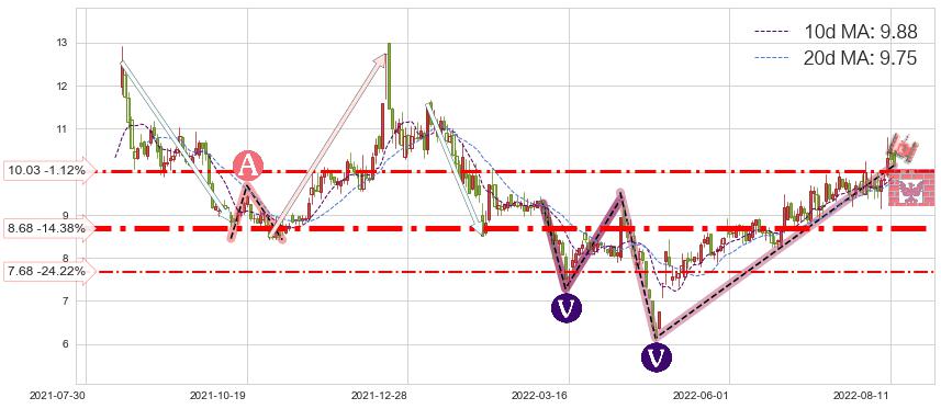 ♘ 支撑价格位8.68,可信任强度88.11%,距离最后交易2022-08-12形成的收盘价格10.14相差 -14.38%