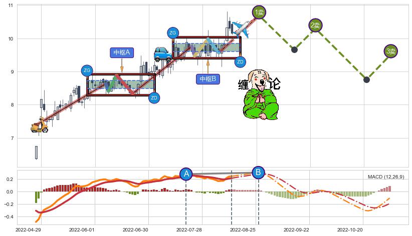 ➣ 【中枢A】:2022-06-08-2022-06-22,中枢由4笔构成,共11交易日, ZG=8.63, ZD=8.41