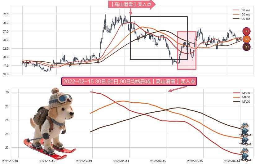 ⚀ 2021-12-10日-2022-04-15日显现 30日-60日-90日均线 【高山滑雪】买入点 看多信号,后市看涨,买入