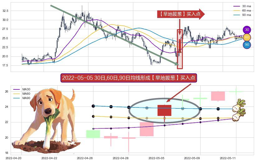 ⚀ 2022-05-05日显现 30日-60日-90日均线 【旱地拔葱】买入点 看多信号,后市看涨,买入