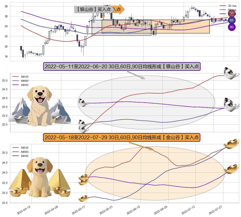 ⚀ 2022-05-19-日至2022-07-29-日显现 30日-60日-90日均线 【金山谷】买入点 其再次确认了买入信号,可靠性更强,买入