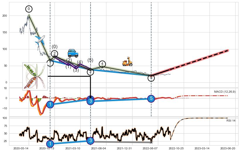 ➣ 第一, 三, 五浪下跌动能逐渐【衰弱变小】,趋势呈现不稳迹象