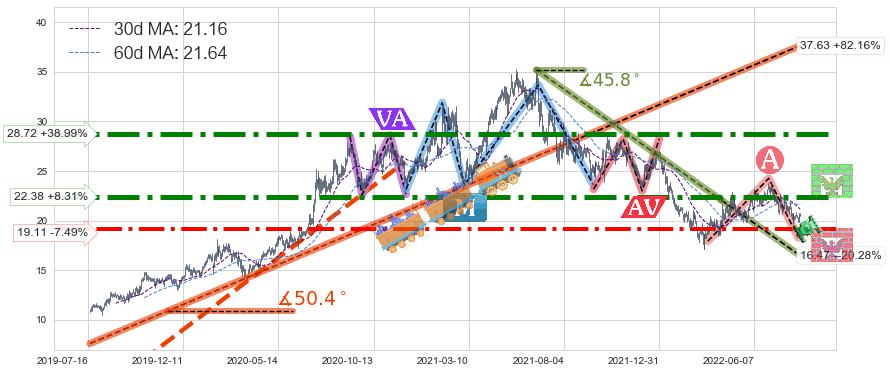 ♘ 阻力价格位22.38,可信任强度87.00%,距离最后交易2022-08-12形成的收盘价格20.66相差 +8.31%
