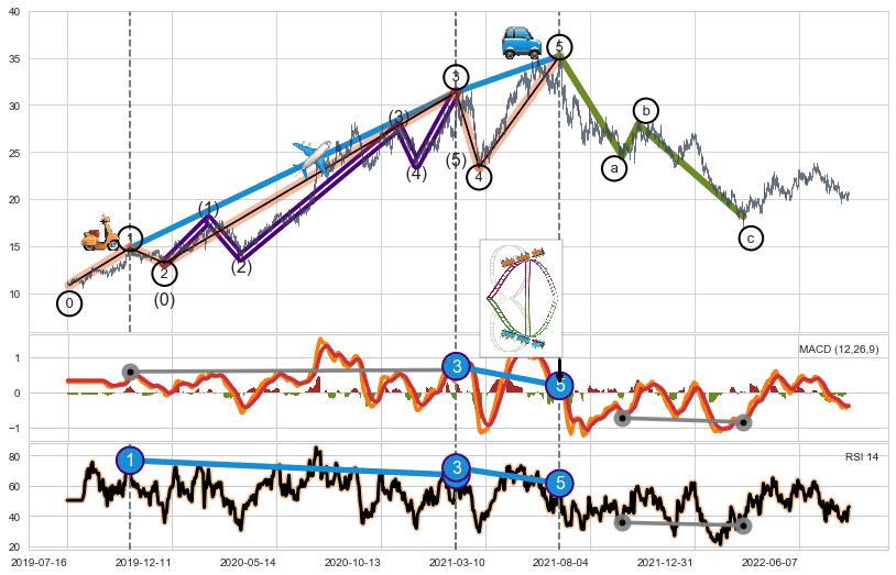 ➢ a,c调整浪MACD, RSI, KDJ走势都【未出现】背离,abc走势延续, 5浪反转概率增强