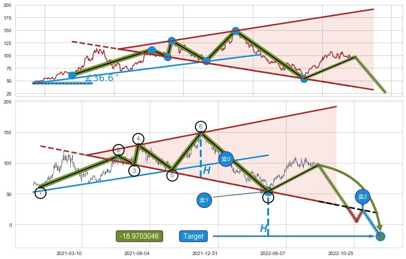 ➢ 最小反转跌幅→𝐇: 73.00 (逐步抬高阻力斜边最后的阻力点⑥与支撑边垂直距离)