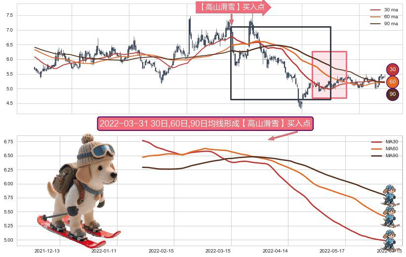 ⚀ 2022-01-24日-2022-06-07日显现 30日-60日-90日均线 【高山滑雪】买入点 看多信号,后市看涨,买入