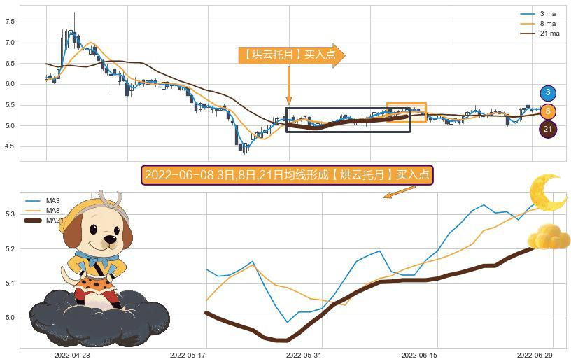 ⚀ 2022-05-17日-2022-06-28日显现 3日-8日-21日均线 【烘云托月】买入点 看多信号,后市看涨,买入