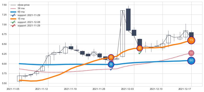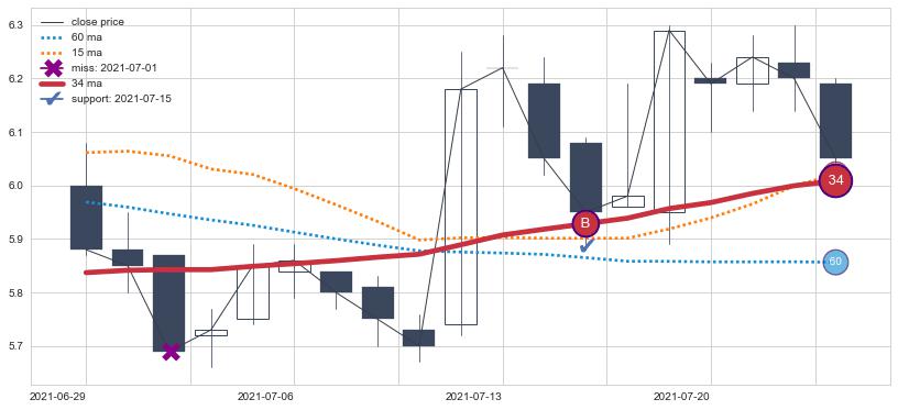 ⚁ MA3和MA8走势平行,且始终保持在短距离内,MA21始终在短中期均线下方,与短中期均线保持一定的距离,微微上行