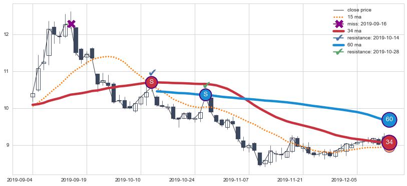 ⚄ 均线向上突破后价格上探力度高,正乖离率高,再次向下破位后维持原均线下跌趋势【弱】