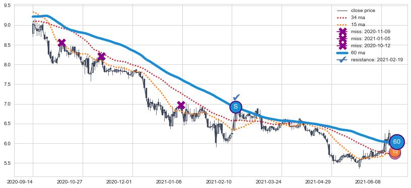 ⚂ 2021-11-16-日均线向上突破,2022-03-14-日重新下穿均线破位,均线阻力再次生效