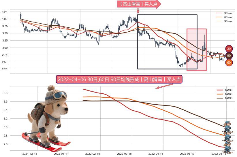 ⚀ 2022-01-24日-2022-06-14日显现 30日-60日-90日均线 【高山滑雪】买入点 看多信号,后市看涨,买入