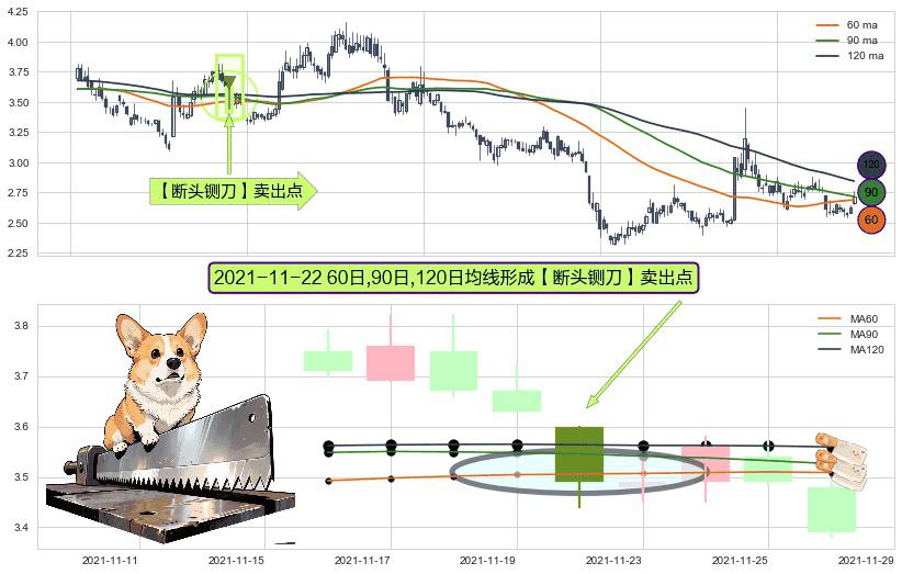 ⚀ 2021-11-22日显现 60日-90日-120日均线 【断头铡刀】卖出点 看空信号,后市看跌,卖出