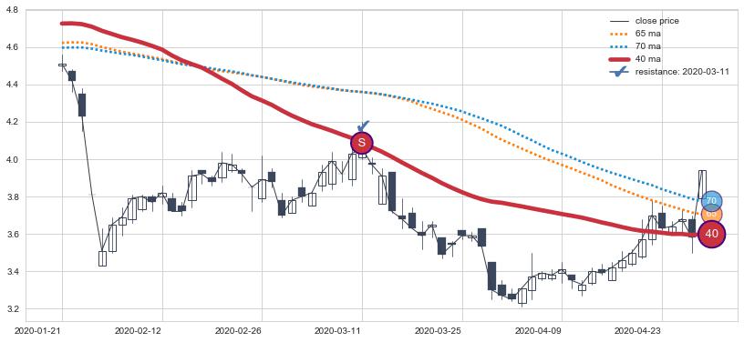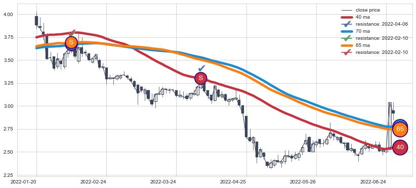➢ 最优均线组合共正确确认支撑阻力信号3处,正确确认率 50.00%