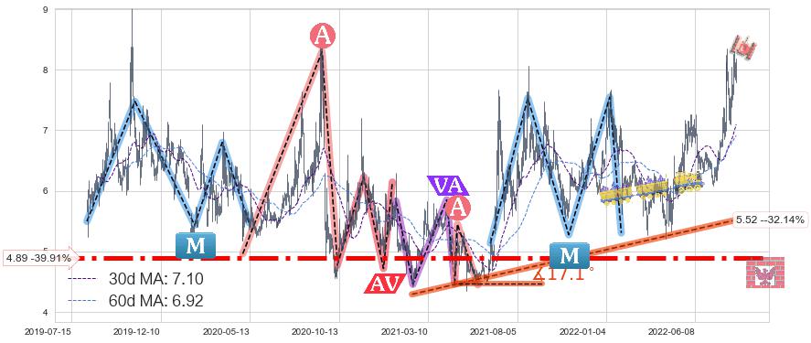 2022-04-18: 第一支撑位4.89有效抑制了下跌浪,成功阻止了价格的继续下跌。