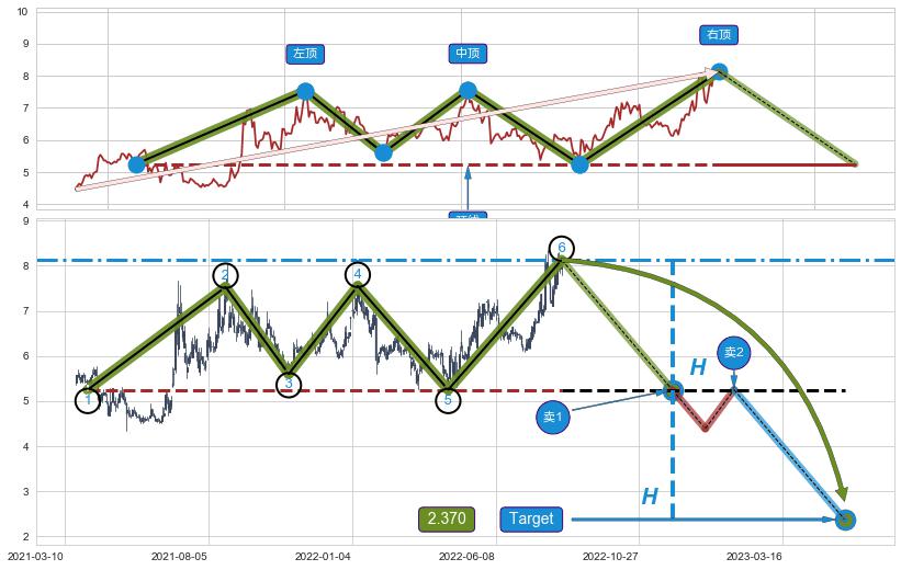 ➢ 最小反转跌幅→𝐇: 2.880 (三重顶波峰高点到两个波谷连线的垂直距离)