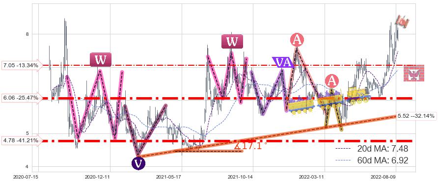 ♘ 支撑价格位7.05,可信任强度51.12%,距离最后交易2022-08-12形成的收盘价格8.13相差 -13.34%