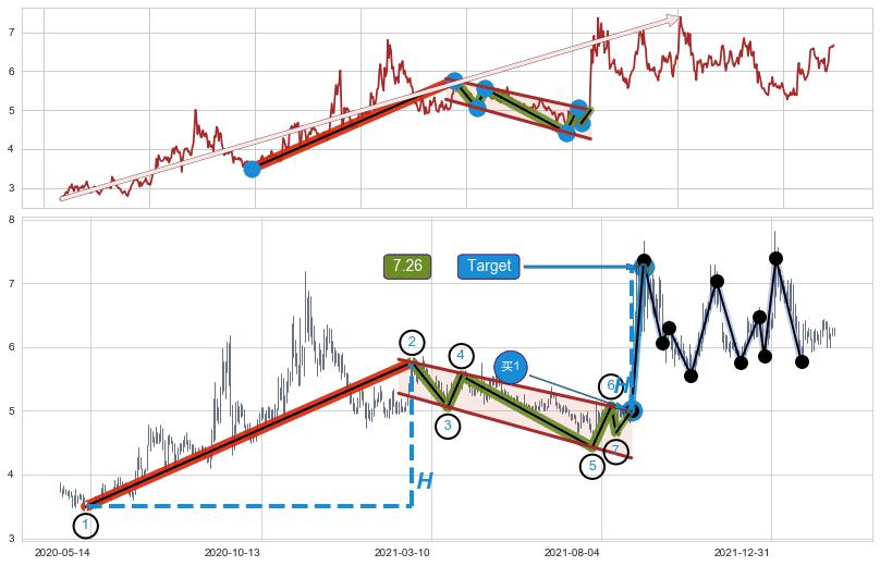 ➣ 最小中继整理涨幅→𝐇: 2.120 (上平行阻力线与下平行支撑线的垂直距离)