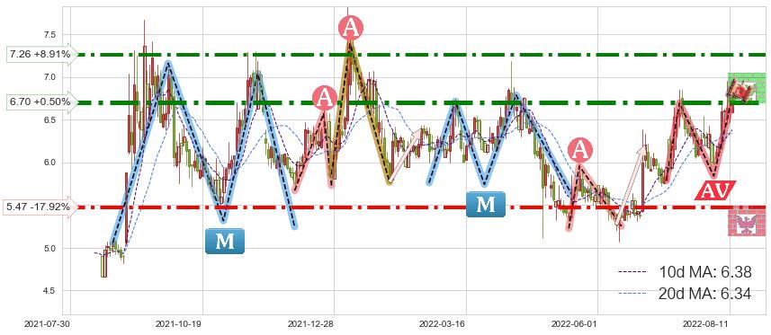 ♘ 阻力价格位6.70,可信任强度94.12%,距离最后交易2022-08-12形成的收盘价格6.67相差 +0.50%