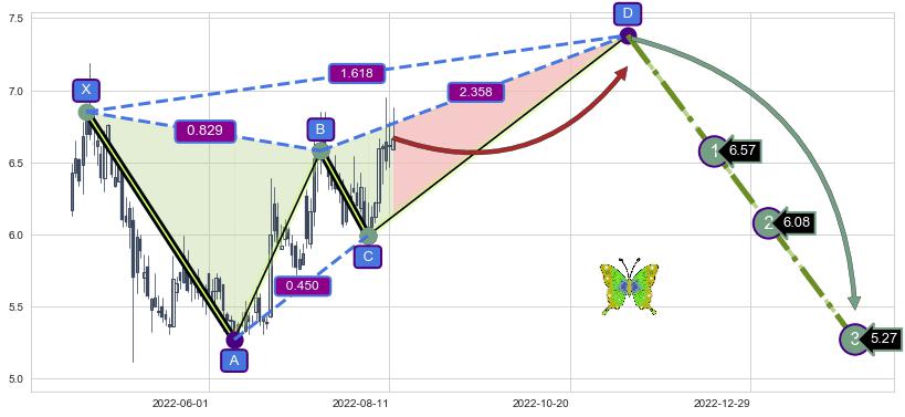 ➣ 未完成【蝴蝶】形态起点X: 2022-04-11, 已到达C点: 2022-08-03, 预测最终D点: 2022-11-11, 共151交易日