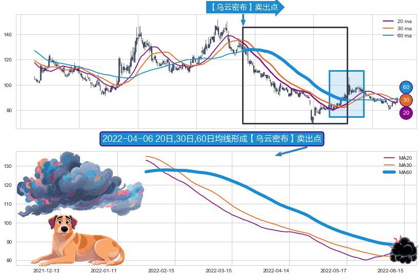 ⚀ 2022-01-25日-2022-06-13日显现 20日-30日-60日均线 【乌云密布】卖出点 看空信号,后市看跌,卖出