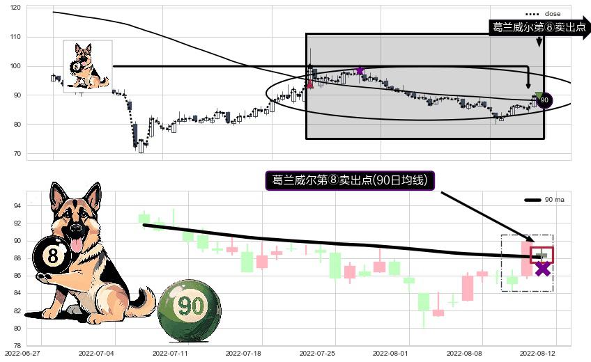 ⚀ 2022-08-12-日显现 葛兰威尔均线 90日均线 第⑧卖出点 下降趋势的中继信号,后市看跌,卖出信号
