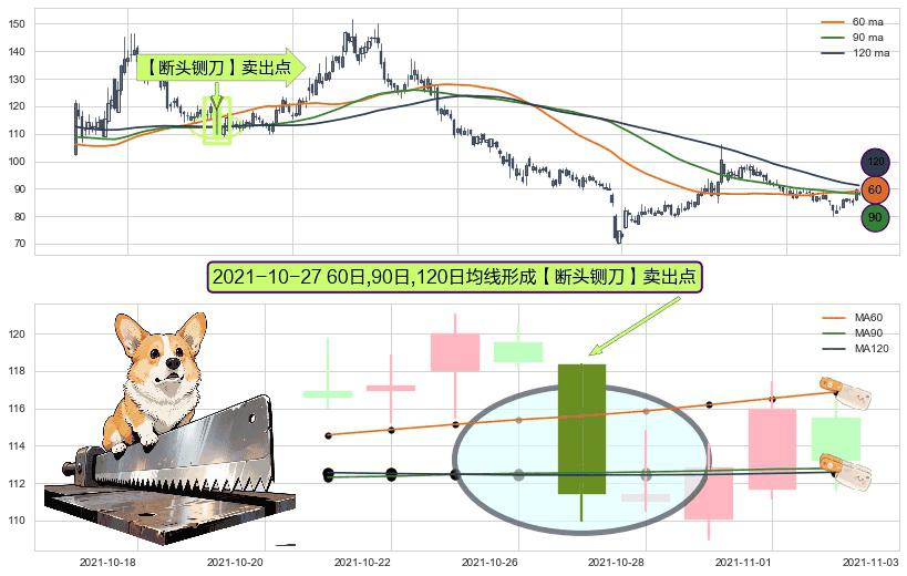 ⚀ 2021-10-27日显现 60日-90日-120日均线 【断头铡刀】卖出点 看空信号,后市看跌,卖出