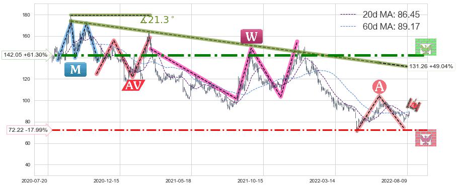 ♘ 支撑价格位72.22,可信任强度55.68%,距离最后交易2022-08-12形成的收盘价格88.07相差 -17.99%