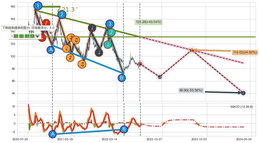 ♘ 在最后的下跌阶段2020-09-02至2022-06-14,存在 持续未破位的阻力位 ,阻力价格131.26,可信任强度83.97%,其距离最后价格88.07相差 +49.04%