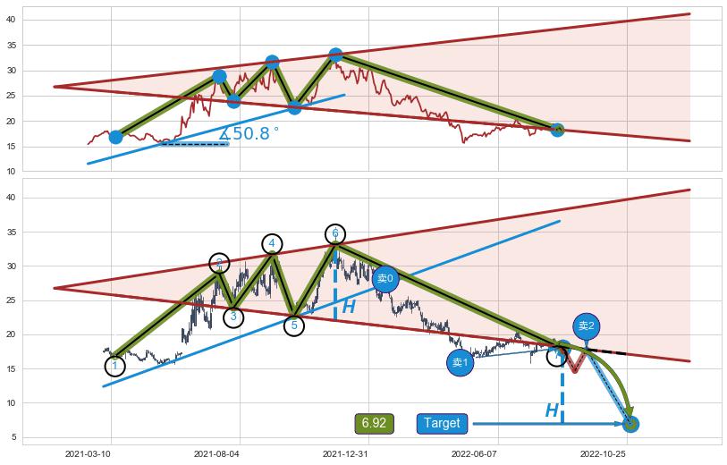 ➣ 【未确认突破,预测即将形成突破】【扩散】三角形反转起点:2021-03-15, 预测突破点:2022-08-16,形态共348交易日