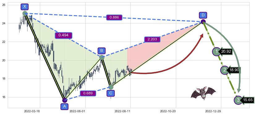 ➢ 未完成【蝙蝠】形态起点X: 2022-02-21, 已到达C点: 2022-07-12, 预测最终D点: 2022-12-01, 共193交易日