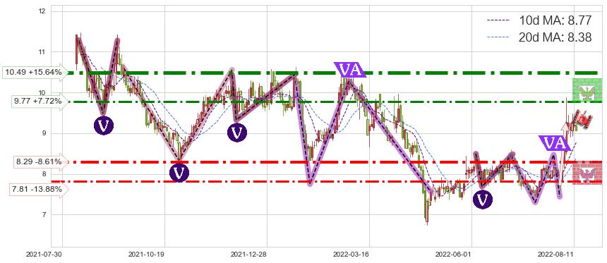 ♘ 阻力价格位9.77,可信任强度67.10%,距离最后交易2022-08-12形成的收盘价格9.07相差 +7.72%