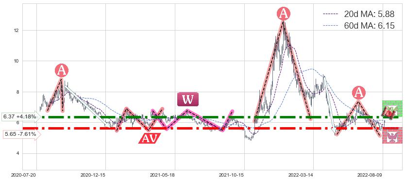 ♘ 阻力价格位6.37,可信任强度87.76%,距离最后交易2022-08-12形成的收盘价格6.11相差 +4.18%