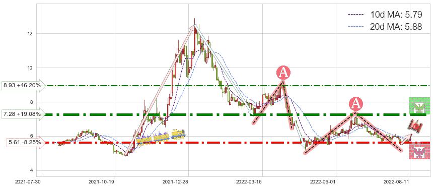 ♘ 阻力价格位7.28,可信任强度87.42%,距离最后交易2022-08-12形成的收盘价格6.11相差 +19.08%