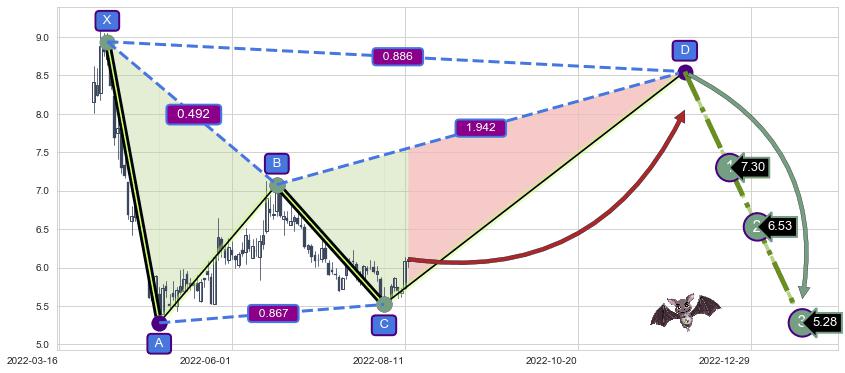 ➣ 未完成【蝙蝠】形态起点X: 2022-04-07, 已到达C点: 2022-08-03, 预测最终D点: 2022-12-02, 共168交易日