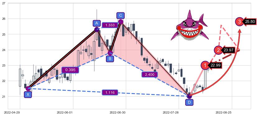 ➣ 已完成【鲨鱼】形态起点X: 2022-05-09, 终点D: 2022-08-03, 共62交易日