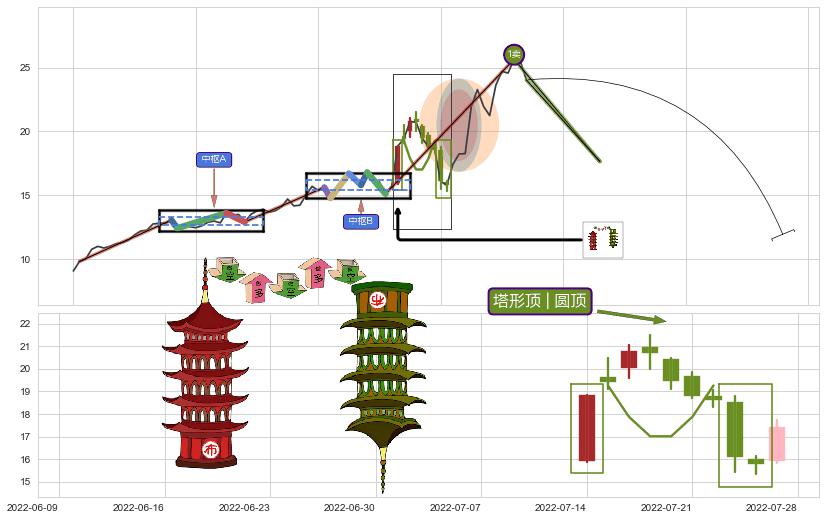 ➣ 【中枢B】:2022-06-28-2022-07-12,中枢由6笔构成,共11交易日, ZG=15.80, ZD=15.62