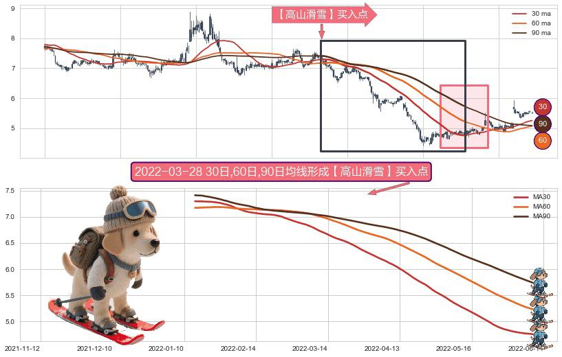 ⚀ 2022-01-13日-2022-06-09日显现 30日-60日-90日均线 【高山滑雪】买入点 看多信号,后市看涨,买入