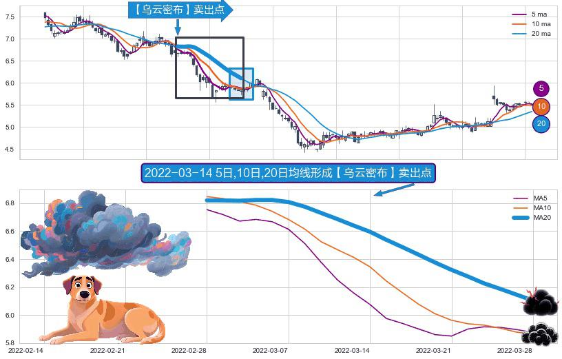 ⚀ 2022-02-28日-2022-03-28日显现 5日-10日-20日均线 【乌云密布】卖出点 看空信号,后市看跌,卖出