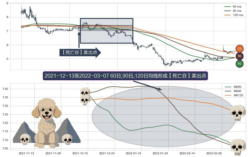 ⚀ 2021-12-14-日至2022-03-07-日显现 60日-90日-120日均线 【死亡谷】卖出点 看空信号,后市看跌,卖出