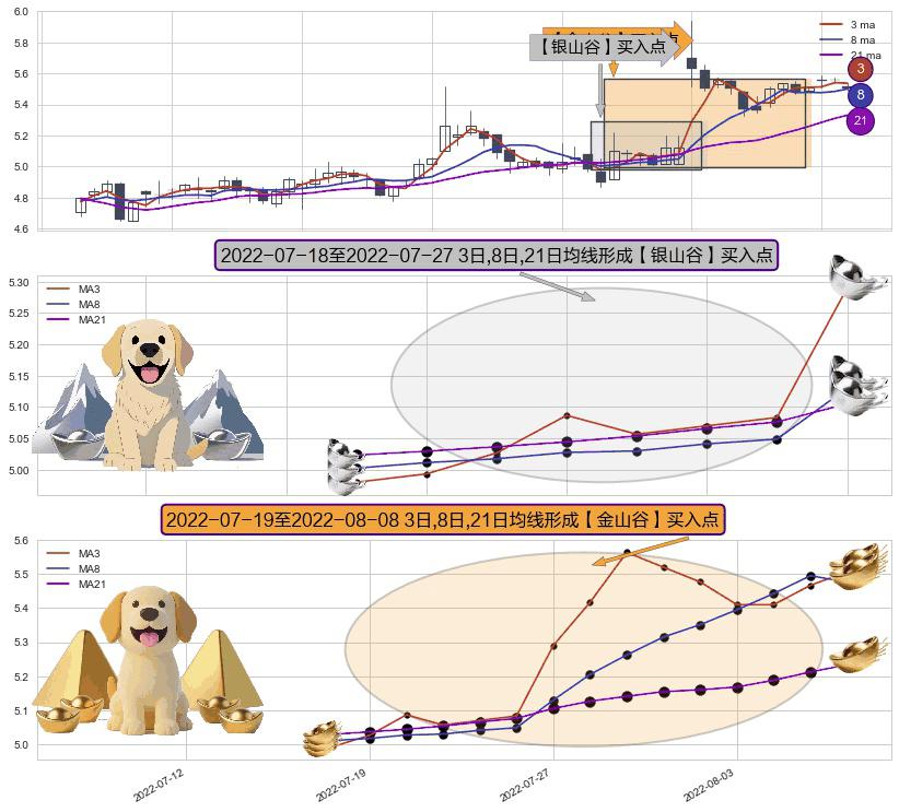 ⚃ 2022-07-20-日至2022-08-08-日显现 3日-8日-21日均线 【金山谷】买入点 其再次确认了买入信号,可靠性更强,买入