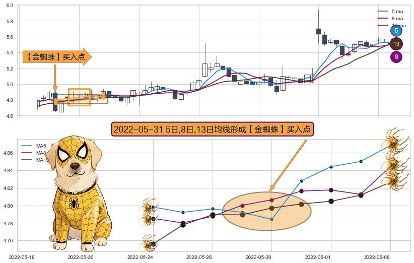 ⚀ 2022-05-31日显现 5日-8日-13日均线 【金蜘蛛】买入点 看多信号,后市看涨,买入